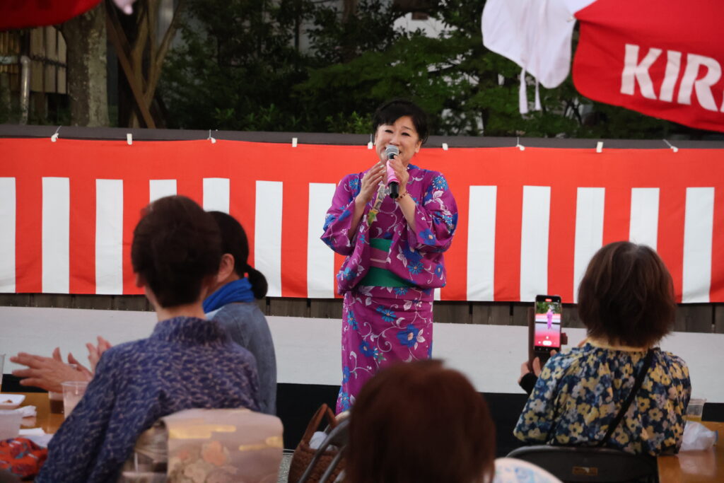 澤さんの伸びやかな歌声が、夕暮れの温泉街に響きます。豊浦中学校の先輩でもある澤さんが故郷の舞台で歌う姿に、まず心を打たれました。