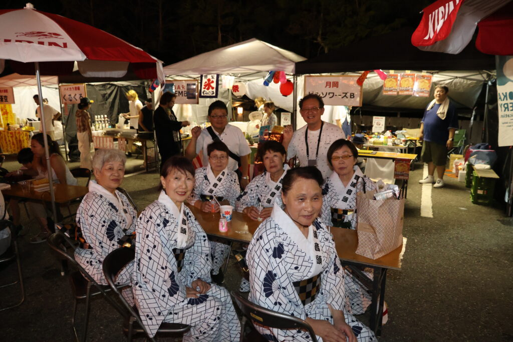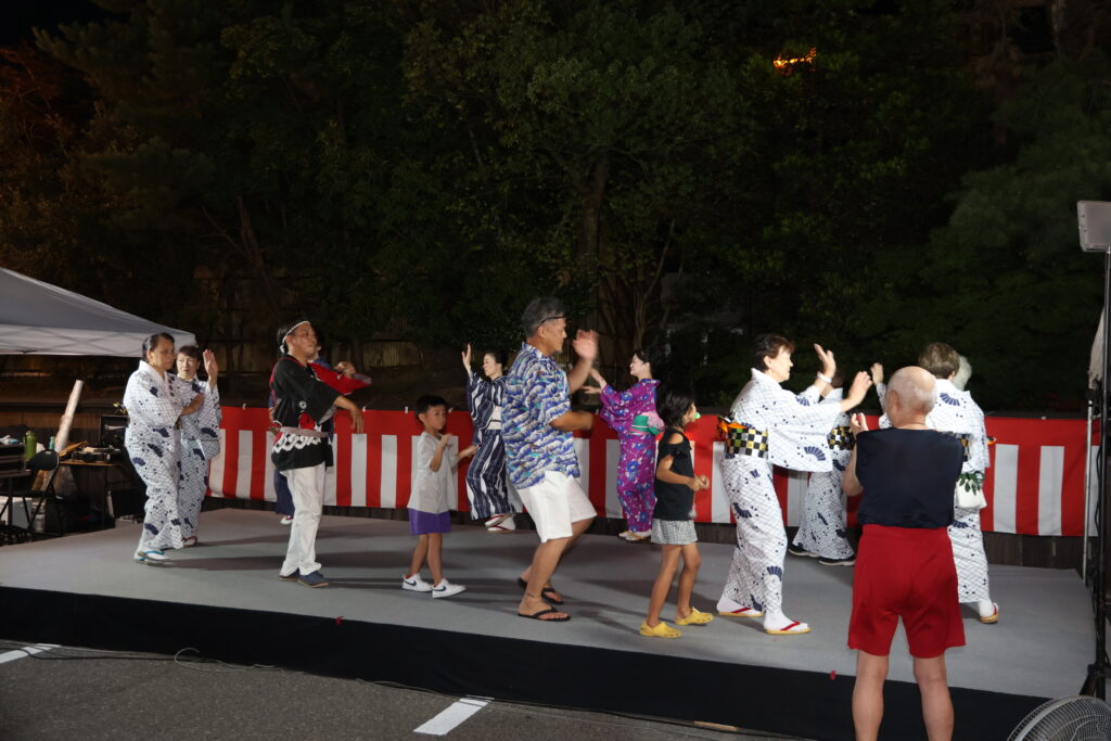 熱気に包まれた会場では、予定より早く盆踊りがスタートしました。最初は豊浦音頭からです。「ハアー春の真木山ヨー、春の真木山みどりに映えて」の美しい歌詞が流れ始めると、最初は慣れない様子だった参加者の皆さんも、音楽が二巡目に入る頃には慣れた様子で、みんなの振り付けも見事に揃ってきました。