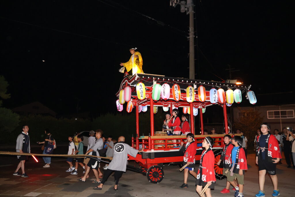 そんな中、山車引きが到着しました。屋根に乗った月岡温泉夏まつり実行委員会の大滝正之委員長の衣装がまるでマツケンサンバのようで、観衆からは大歓声が沸き起こります。